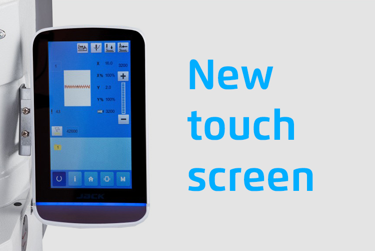 Machine à coudre électronique pour points d’arrêt/boutons (kit de changement de pinces inclus), une machine pour 2 types de travaux et une large gamme de fonctions. Panneau de commande tactile simple et intuitif affichant les fonctions et les schémas.